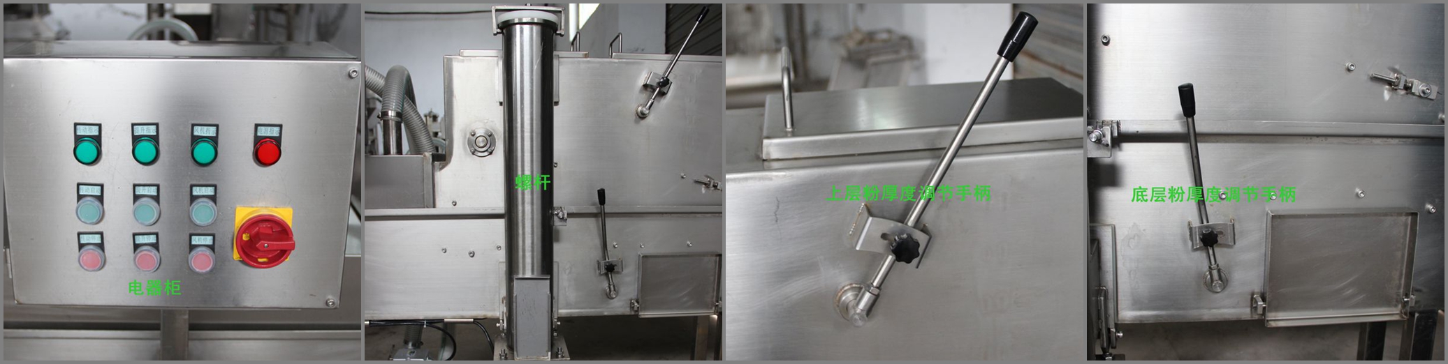 全自動(dòng)上粉機(jī)能自動(dòng)完成產(chǎn)品的上粉過程,適用于各種預(yù)上粉、混合粉等。產(chǎn)品進(jìn)入下網(wǎng)帶,底部及側(cè)面沾滿粉,從上料斗流下的粉將產(chǎn)品上部覆蓋,經(jīng)壓輥壓緊(上下網(wǎng)帶上的粉厚度可以方便調(diào)節(jié)),上粉后經(jīng)過風(fēng)管,將多余的粉吹落。進(jìn)入下一道程序。