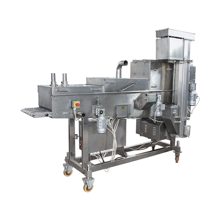 裹粉機能自動完成產(chǎn)品的預(yù)上粉過程,適用于各種預(yù)上粉、混合粉以及細面包糠到中等顆粒面包屑裹涂。產(chǎn)品進入下網(wǎng)帶,底部及側(cè)面沾滿粉,從上料斗流下的粉將產(chǎn)品上部覆蓋,經(jīng)壓輥壓緊(上下網(wǎng)帶上的粉厚度可以方便調(diào)節(jié)),上粉后經(jīng)過風(fēng)管,將多余的粉吹落。進入下一道程序。