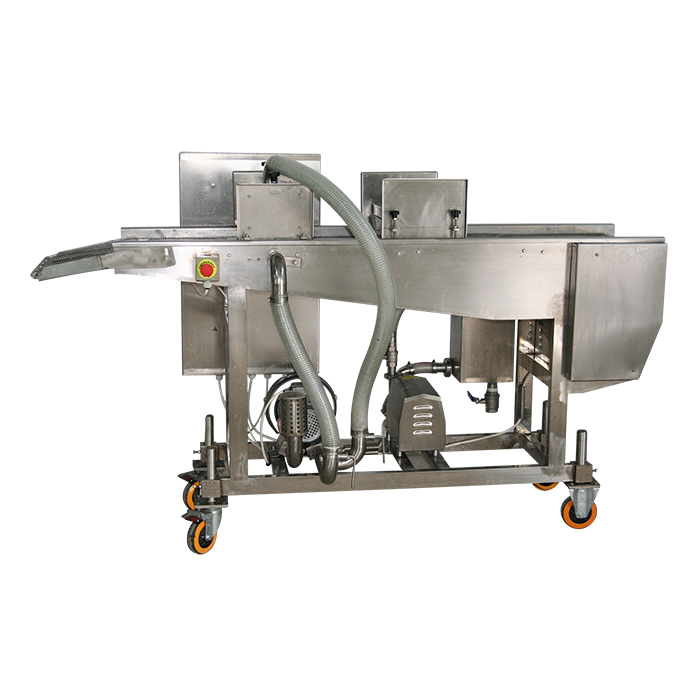 上稀漿機(jī)是通過(guò)漿幕和下部的承漿板把漿液均勻粘附在產(chǎn)品上,通過(guò)風(fēng)刀時(shí),多余的漿液被吹掉。然后輸入到下一工序。淋漿機(jī)適用于上面包屑和上粉前的工藝。雞塊掛漿機(jī)適合于雞肉、牛肉、豬肉、魚(yú)、蝦等海鮮產(chǎn)品,雞塊裹漿機(jī)可以對(duì)市場(chǎng)上流行的雞腿,雞排,魚(yú)排,漢堡肉餅、麥樂(lè)雞塊、魚(yú)香漢堡肉餅、土豆餅、南瓜餅、肉串等產(chǎn)品進(jìn)行上漿處理,是食品工廠理想的上漿設(shè)備。
