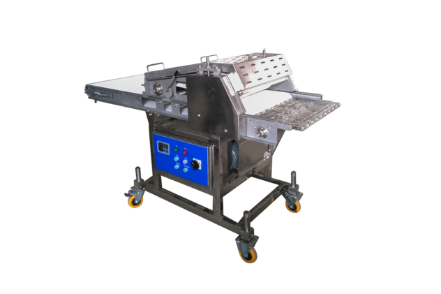 壓延機(jī)將新鮮或冷凍的原料肉經(jīng)過(guò)4道壓輥壓延至規(guī)定的厚度,增加產(chǎn)品的表面積,達(dá)到相同的熟化效果情況下,縮短了油炸時(shí)間。牛肉壓整機(jī)是牛排、雞排、豬排理想的生產(chǎn)設(shè)備之一。